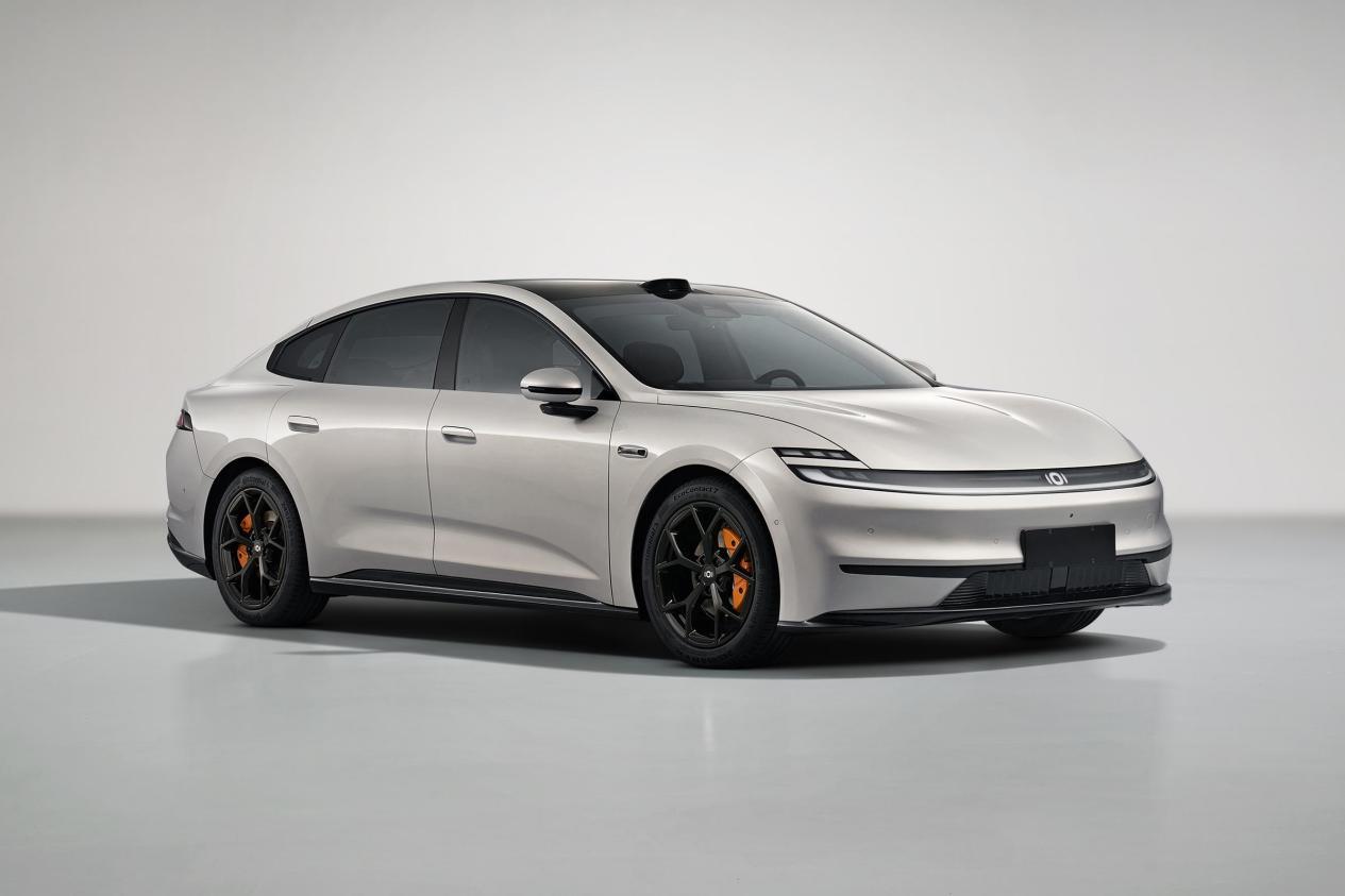 启源A06的整体外观呈现的是低趴造型,以运动轿跑风格为核心。前脸采用不一样的分层式灯组和发光 LOGO 来打破新能源车一道杠的单调,贯穿式弧形大灯组由236颗LED组成,形成 “微笑前脸”,解锁时呈现动态迎宾效果。前保险杠两侧的熏黑导流槽嵌入蜂窝纹理,搭配选装的橙色刹车卡钳罩,强化运动基因。