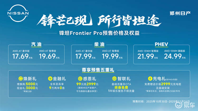 为回馈首批用户,郑州日产同步推出覆盖“购车、用车、养车”全周期的“五大预售权益”,让用户既能享受到增换购/现金优惠、灵活金融方案、老客户专属补贴等“满满实惠”,又能获得智联服务、PHEV车型充电桩赠送等“价值体验”,实现从购车决策到日常用车的全方位保障。即日起,用户可微信搜索“郑州日产俱乐部”小程序参与预售,提前锁定专属权益。