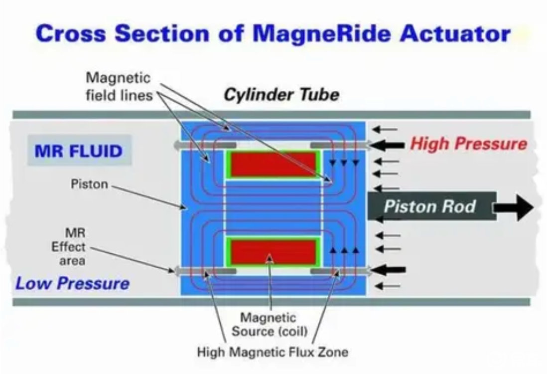 磁流变悬架,通过在阻尼器内部添加微米级磁性颗粒的油液而让其具备磁性。因此在施加磁力时,这些颗粒会沿磁力线有序排列成链状结构,从而使得阻尼液体与磁力强度的正比关系去增加油液粘度。整个过程不仅能在1毫秒左右完成,而且它还可以对复杂路况做出迅速而合适的反应。