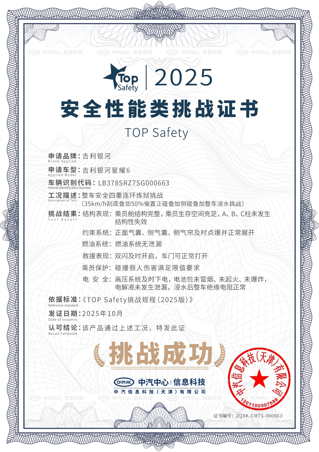 此前,星耀 6 成功通过中汽中心行业首个超国标整车安全四重连环挑战:以超现行标准 16% 的速度完成正面刮底碰撞、60km/h 偏置正面碰撞、2.1 倍国标能量的侧面碰撞,以及 3 倍国标深度的浸水测试,碰撞后乘员舱结构完整、车门可正常开启、电池无起火泄漏。在 “玩车报告” 极限测试中,同一台车连续完成高速避障、3 米高空坠落与 56km/h 极速穿墙,悬挂与电池抗冲击能力优异,进一步验证其全场景安全实力。