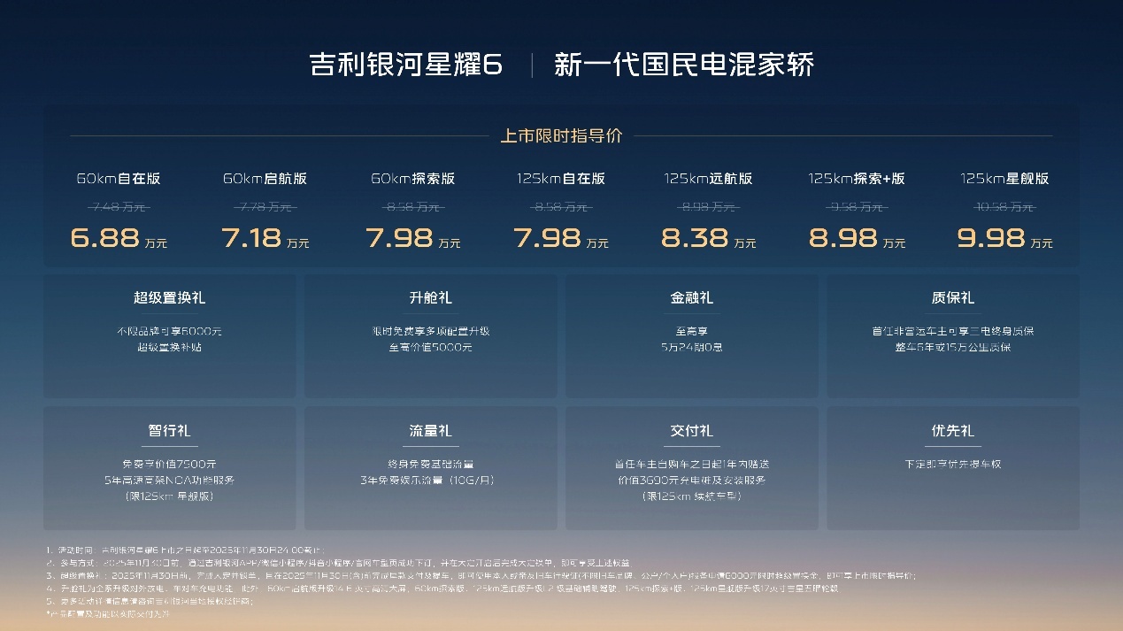 为让更多用户轻松拥有高品质电混家轿,吉利银河针对星耀 6 推出限时专属福利。即日起至 2025 年 11 月 30 日 24:00,用户成功下订即可享受多重权益:不限品牌的 6000 元超级置换金,大幅降低旧车换购成本;全系车型免费升级对外放电、车对车充电功能,其中 60km 启航版增配 14.6 英寸高清大屏,60km 探索版与 125km 远航版升级 L2 级基础辅助驾驶,125km 探索 + 版及星舰版则配备 17 英寸吉星五曜轮毂的 “升舱礼”;金融方面至高可享 5 万 24 期 0 息,减轻资金压力;质保层面,首任非营运车主可享三电终身质保与整车 6 年或 15 万公里质保,用车更安心。